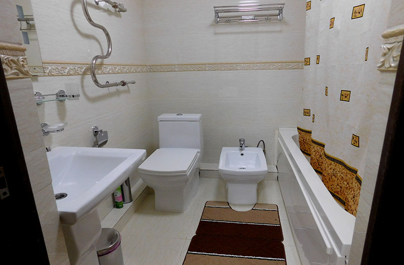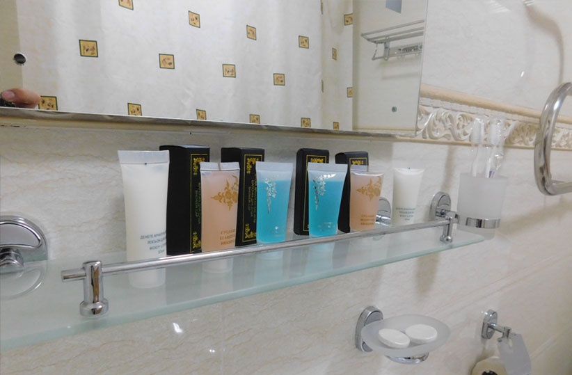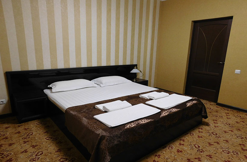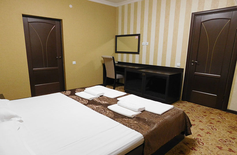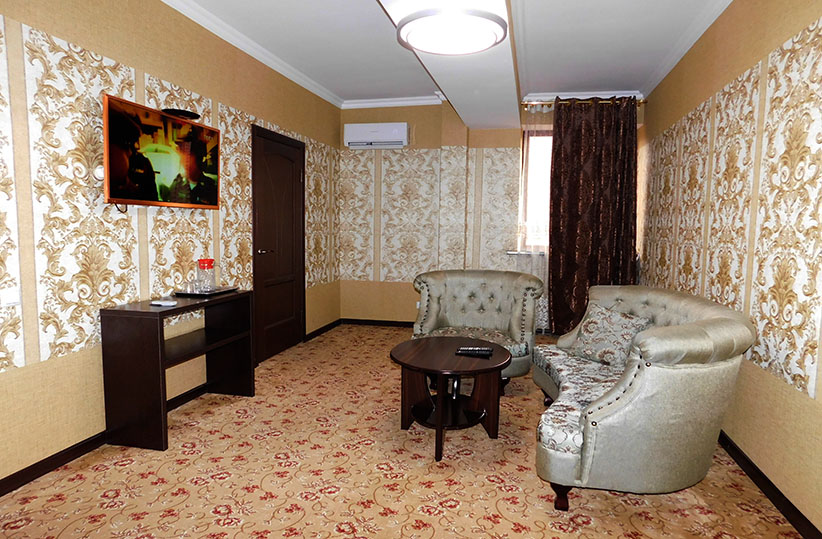 50 кв. м. 2 комнаты (спальня и гостиная), новая удобная мебель с широкой кроватью, кондиционер, телефония, кабельное телевидение (Полный пакет 136 каналов), свежие фрукты в номер ежедневно, холодильник, электронный сейф с персональным кодом, 2 сан.узла, ванной, феном и набором туалетных принадлежностей , wi-fi в комнате для гостей бесплатно, детская развлекательная комната, бильярд, настольный теннис, шашки, шахматы. Непосредственно перед санаторием имеется сквер для пеших прогулок.